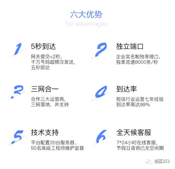 作為互聯網垂直領域快速發展的典型代表,論體量,創藍 253 與行業巨頭還有些許差距;論影響力,創藍 253 為短信行業重新制定產品價格,社群營銷等樹立了新的發展尺度;論行業創新,創藍 253 為行業貢獻了 5 秒必達,獨立端口,三網合一,高達到率,技術支持,全天候客服,可追蹤短鏈接, 空號檢測,上行回復等新的技術與辦事尺度。