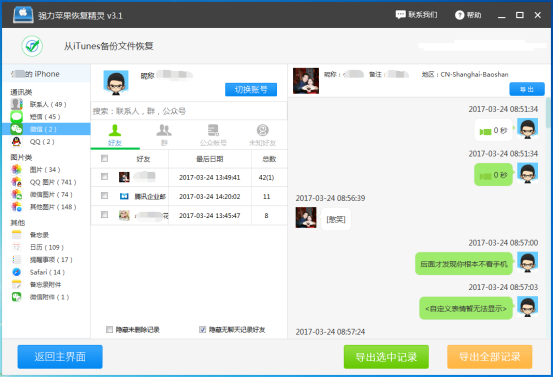 4、掃描完成之后,在界面左側(cè)點擊“微信”一欄,旁邊就會顯示有賬號以及好友列表,點擊列表中的好友右側(cè)都顯示詳細(xì)的微信聊天記錄,在其中找到之前誤刪的勾選上,之后點擊“導(dǎo)出選中記錄”按鈕,軟件就開始恢復(fù)選中的微信聊天記錄了。