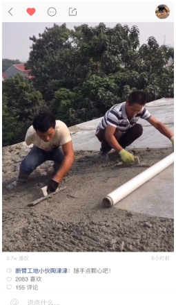 在工地干活,,津津總是非常賣力,從不懈怠。“每個人都有分工,我要掉鏈子了,大家伙就都得等著。” 短視頻中可以看到,雖然只有一只手,但陶津津的干活速度比同伴快很多。
