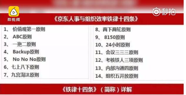 8 月 30 日,京東發布《京東人事與組織效率鐵律十四條》,其中有不少不能碰的紅線。在是十四條鐵律中,提及“員工能力很強,但是價值不雅觀不過關的,是鐵銹,是要堅決去除的。” 24 小時原則,要求所有辦理者對于任何工作請示及需要批復的郵件 24 小時內必需回復。所有辦理者必需保證電話 24 小時開機并接聽電話,連結溝通渠道的順暢。