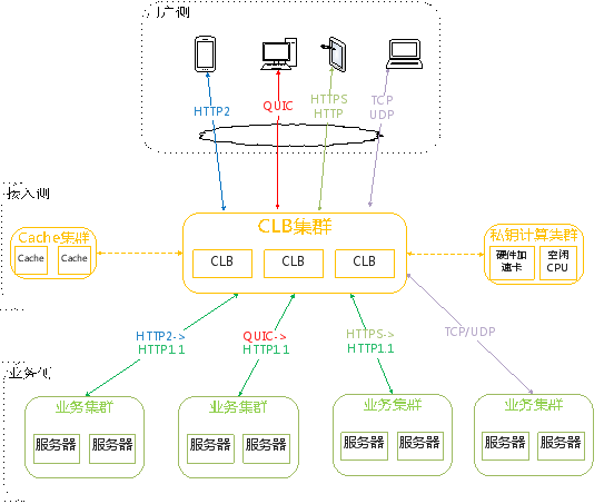 3. CLB針對請求進行解析,如果需要私鑰計算(好比TLS完全握手),會將部分重要參數轉發到私鑰計算集群進行高強度計算。如果需要查詢Session ID或者Server Config ID,會做一些緩存查詢。這樣能夠減少計算量,也能減少握手時間;