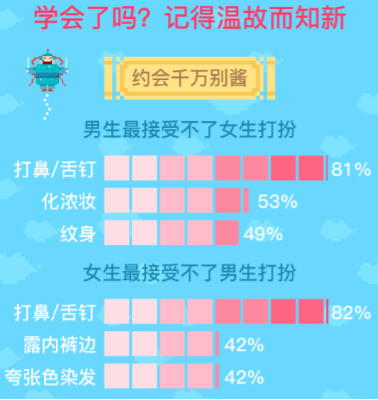 當然,除了鮮花與禮物之外,約會的準備工作也必不成少。按照調研陳訴顯示,怪異的的打扮如”打鼻釘/舌釘“最無法被男女性接受,此外,男性不喜歡女性約會”畫濃妝“和”紋身“;而女性則反感男性”露內褲邊“和”夸張色染發“。而在用餐時,”鄙言穢語“成為了男女最反感的內容,此外,男性反感女性“大聲喧嘩”和“對辦事員態度狂妄”;女性反感男性“亂扔殘渣剩菜”及“吃飯吧唧嘴”。當然,如果你有燒得一手好菜的本事,那情人節的約會能給你加分不少。數據顯示,近七成的男性會選擇在情人節親手制作美食給女伴品嘗,而女性中也有近五成的人選擇用本身擅長的烘焙來給本身的男伴表達心意。