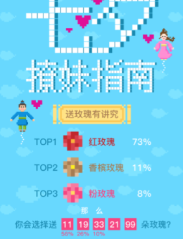 情人節的劇情雖然已經老套,但被平淡包抄的生活總是需要儀式感的,節日的出現便給了這份儀式感一個機會。按照此次聯合調研顯示,七成男性和近九成女性仍然對節日的小浪漫抱有期待,而這份期待卻并沒不需要太大成本,對折男性與七成女性體現,重要日子里收到有心意的禮物即可。對于男性而言,情人節送花成了固定選擇。其中,73%的人選擇紅玫瑰,11%的人選擇香檳玫瑰。而在數量上,11朵成了主流選擇,占男性選擇人數的56%,其次為19朵和33朵,別離占比26%和10%。