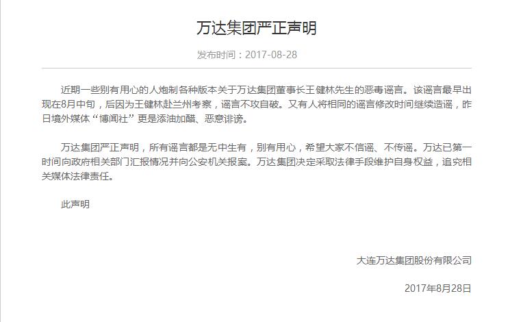 近期一些醉翁之意的人炮制各種版本關(guān)于萬達(dá)集團(tuán)董事長王健林先生的惡毒謠言。該謠言最早出現(xiàn)在 8 月中旬,后因?yàn)橥踅×指疤m州考察,謠言不攻自破。又有人將相同的謠言修改時(shí)間繼續(xù)造謠,昨日境外媒體“博聞社”更是添油加醋、惡意誹謗。