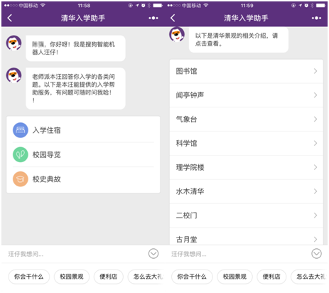此次推出的“清華入學助手”是搜狗搜索為清華大學深度定制的智能問答客服系統,依托搜狗搜索領先的智能問答技術,以搜狗汪仔的形象作為客服角色,以人機智能對話回答提問作為主要辦事方式,同時提供了傳統的報到流程、住宿規章、生活指南等結構化的信息呈現。
