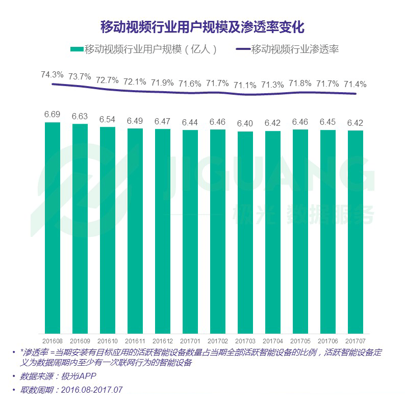 截至 2017 年 7 月,移動視頻市場滲透率為71.4%,用戶規模約為6. 42 億
