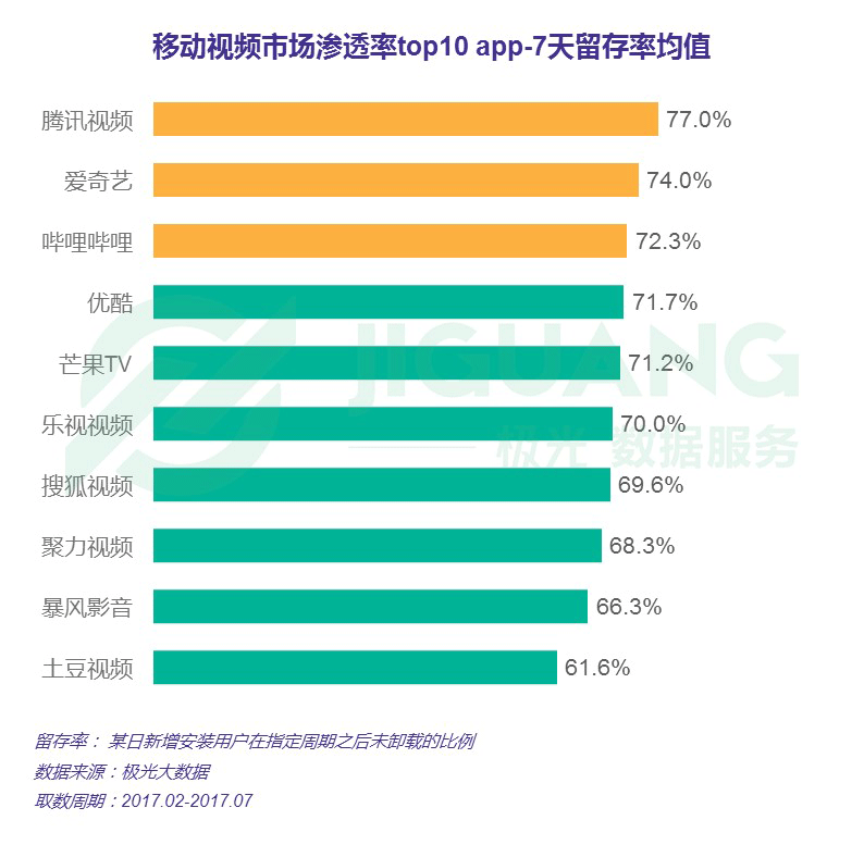 ? 在騰訊視頻、愛奇藝和嗶哩嗶哩的新增用戶中,別離有77.0%、74.0%和72.3%的用戶在安置 7 天后仍保存了該app
