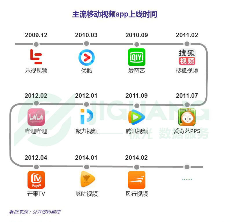 ? 2009年,樂視視頻推出移動端app;2010- 2012 年,愛奇藝、搜狐視頻、騰訊視頻、嗶哩嗶哩相繼推出移動視頻app; 2014 年,咪咕視頻和風行視頻相繼進入移動視頻市場