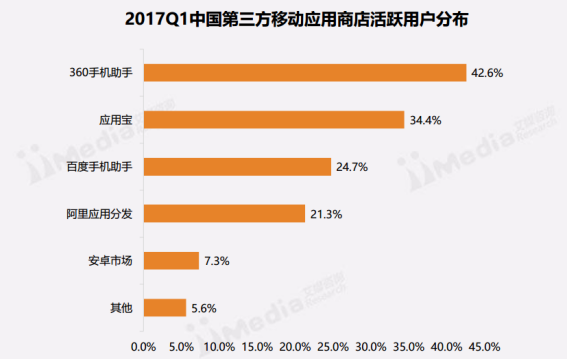 綜合近幾個月的TalkingData公布的數據來看, 360 手機助手在 2017 年已連續七個月在用戶活躍率等方面領跑行業。無獨有偶,艾媒咨詢此前發布的《2017Q1 中國移動應用商店季度監測陳訴》(以下簡稱“陳訴”)也顯示, 2017 年第一季度, 360 手機助手以42.6%的用戶活躍度連結領先地位,與其它應用分發平臺拉開了較大差距。