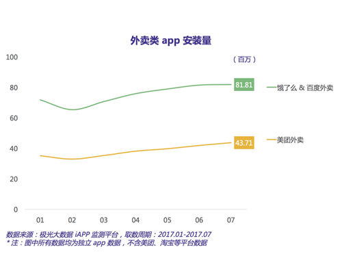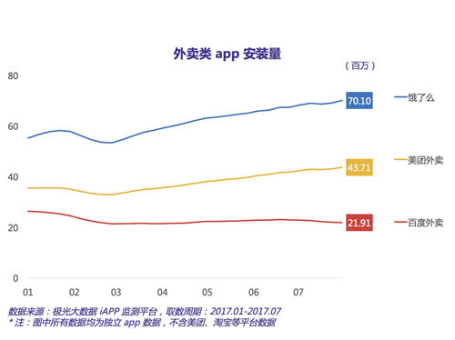 在 3 款頭部應用中,安置量最高的是餓了么,達到7, 010 萬。美團外賣和百度外賣別離以4, 371 萬和2, 191 萬的安置量排在第二、三位。