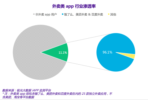 極光大數據的監測結果顯示,截至本年 7 月底,外賣類應用在全國移動網民中的滲透率為11.1%。在這部分人群中,餓了么、美團外賣和百度外賣用戶合共占據了96.1%的份額。