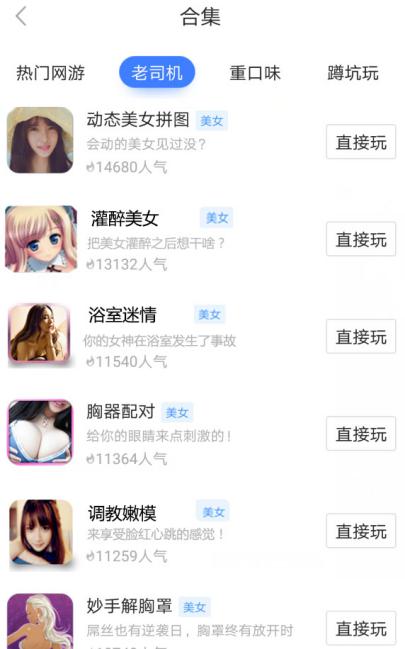 游戲的分類很多,休閑、益智、冒險(xiǎn)等等包羅萬(wàn)象,但是在保舉游戲合集上,赫然有“老司機(jī)”分類在其中,而打開(kāi)具體內(nèi)容一看,果然都是老司機(jī)才玩的游戲,“美女”“性感”的元素突出的淋漓盡致。