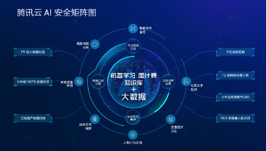 騰訊云發(fā)布的AI安適能力矩陣圖,以大數(shù)據(jù)、機(jī)器學(xué)習(xí)、圖計(jì)算、知識(shí)庫(kù)等當(dāng)前熱門(mén)AI技術(shù)為核心,驅(qū)動(dòng)社交圖譜分析、圖像自動(dòng)識(shí)別、知識(shí)表達(dá)推理、自然語(yǔ)言處理 4 大能力組合,形成智能身份鑒定、威脅情報(bào)分析、異常流量檢測(cè)、網(wǎng)絡(luò)攻擊溯源、人機(jī)行為識(shí)別、惡意圖片識(shí)別、垃圾文本檢測(cè)等 7 項(xiàng)技術(shù)應(yīng)用。