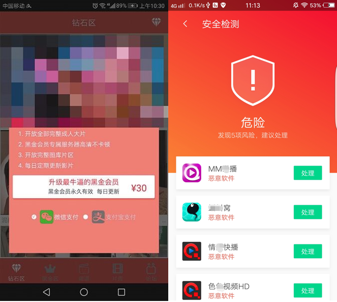 實際上,該色情APP只是以“充值會員不雅觀看完整版”為借口,誘導用戶踏入充值的陷阱。對此,騰訊手機管家依托自研殺毒引擎TAV,實現對情X快播、XX影院、XX窩和MMX播等多款涉黃應用的精準查殺,制止用戶陷入涉黃APP誘導充值的套路。
