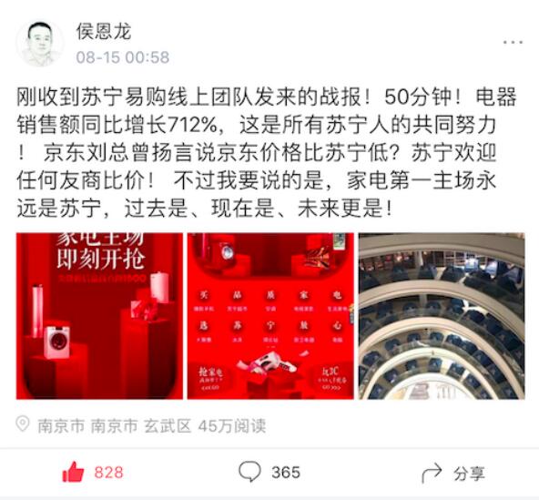 818 到來在即,蘇寧發燒節數戰告捷,發一則戰報再正常不過,但侯恩龍沒忘記貶損一下老對手京東——“京東劉總曾揚言說京東價格比蘇寧低?蘇寧歡迎任何友商比價!”然后宣稱家電第一主場永遠是蘇寧。