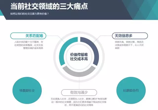 當下,傳統社交面臨著三大難解困境:一、關系匹配難,不能很好地解決信任關系及個性化特征信息的傳遞問題(社交領域的價值傳輸),人際關系匹配存在明顯的效率瓶頸;二、無用信息多,信息失真、過載,篩選及決策成本高居不下,且受制于諸多現實因素,無以解決社交資源的供需平衡問題;三、有效溝通少,無論是熟人社交,還是陌生人社交,都難以解決“有效溝通”這一根本的社交難題,因為它們更多的基于人們的社會身份,而不是演進式的社交網絡,也就難以制止現實的、昂揚的社交關系辦理及維護成本。