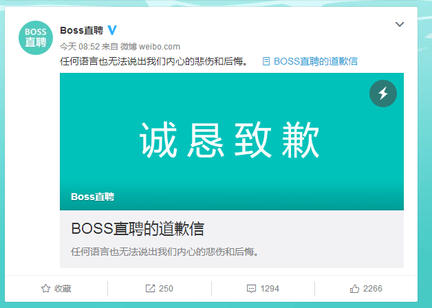 創業三年多,這是我們所經歷的最為哀痛和艱難的日子。回顧創業之初,平臺上的人們相互信任,平等溝通,簡單直接。正是因為來自用戶的信任和口碑,BOSS直聘才得以發展起來。今天,那些在BOSS直聘上找到工作,可以安身立命、養家糊口的人們;那些通過BOSS直聘招募到伙伴,可以一起追求夢想的人們,你們肯定也為我們犯下的錯誤感到痛心,我們的確辜負了你們一直以來的信任。