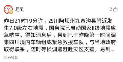 易到已于昨晚第一時(shí)間調(diào)集四川境內(nèi)車輛組成緊急救援車隊(duì),與本地政府取得聯(lián)系,隨時(shí)等候調(diào)遣趕赴災(zāi)區(qū)支援。易到體現(xiàn),目前在成都地區(qū)已調(diào)遣約 200 輛專車和星車隊(duì)的 70 余星車主全部待命,可隨時(shí)聽候調(diào)遣。別的,平臺本地辦事商也已于昨夜間調(diào)集了 30 臺大巴車輛,率先趕赴災(zāi)區(qū)前線集結(jié)待命。