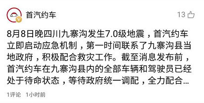 首汽約車本地全員配合抗震救災(zāi)