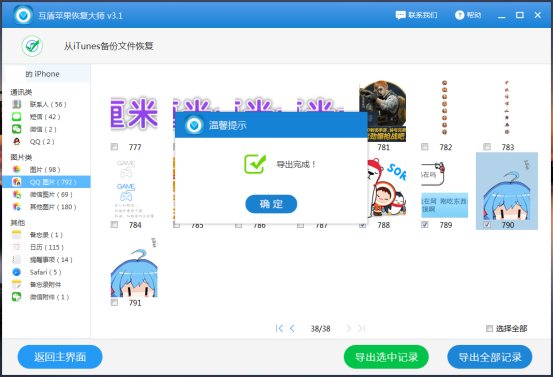 第三步:軟件開始掃描iTunes數(shù)據(jù)了,在掃描過程中,我們需要耐心等待,掃描完成后,我們?cè)跀?shù)據(jù)的恢復(fù)界面,可以看到恢復(fù)的選項(xiàng),我們點(diǎn)擊“圖片類”,在右側(cè)可看到全部的照片,我們找到被誤刪的照片,然后勾選中,點(diǎn)擊“導(dǎo)出選中記錄”即可。