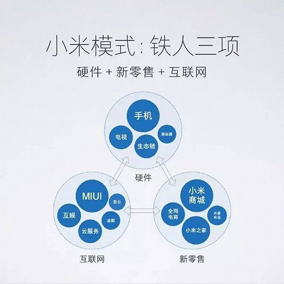 雷軍將小米的成功歸納為“鐵人三項”理論,在本年阿里巴巴網(wǎng)商大會上,雷軍將“鐵人三項”升級為“硬件+互聯(lián)網(wǎng)+新零售”。
