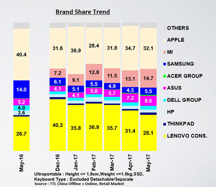 小米條記本也確實爭氣。按照全球市場研究公司GFK統(tǒng)計數(shù)據(jù)顯示,從 2016 年 12 月到本年 5 月,小米在中國輕薄條記本市場份額接近15%,穩(wěn)居第三位,僅次于聯(lián)想和蘋果,甚至超過了戴爾、HP、華碩等老牌國際PC品牌。