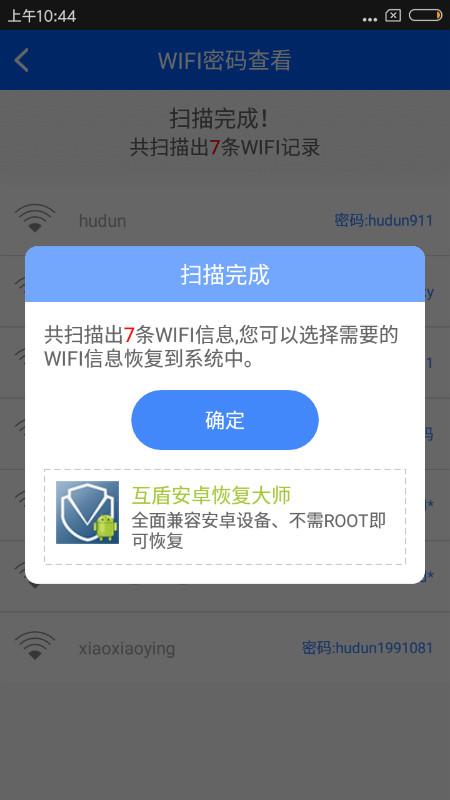4.掃描結束后,軟件就會彈出掃描完成的提示框,我們不單可以預覽掃描的結果,點擊界面的“確定”按鈕,還可對具體的WiFi賬戶密碼進行查看。