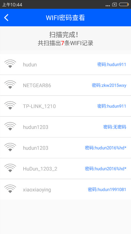 5.進入WiFi密碼查看界面,就可以看見所有連接的WiFi賬戶及密碼,我們找到忘記的WiFi賬戶,就可查看相應的WiFi密碼。