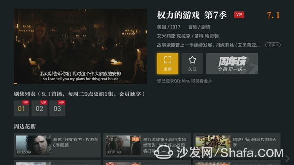 使用智能電視/電視盒子的小伙伴可以通過沙發管家客戶端安置“騰訊視頻TV版”,不雅觀看《權力的游戲第七季》全網首播。