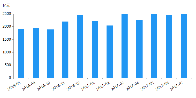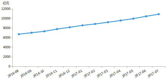 截至 2017 年 7 月底, P2P網貸行業貸款余額增至10897. 08 億元,環比 6 月底增加了4.28%。P2P網貸行業貸款余額仍舊平穩上升,這是資金持續凈流入P2P 網貸行業的表現,也表白廣大投資人仍舊看好P2P網貸行業的發展前景。