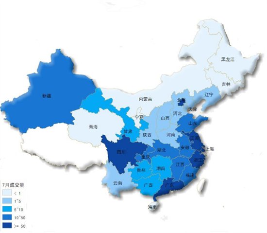 7 月成交量環比下降的主要有上海、重慶、山西、黑龍江等 10 個地區,其中重慶、山西、黑龍江、河北、甘肅下降幅度較大,超過10%;其中,重慶成交量為12. 08 億元、山西的成交量為1. 22 億元。