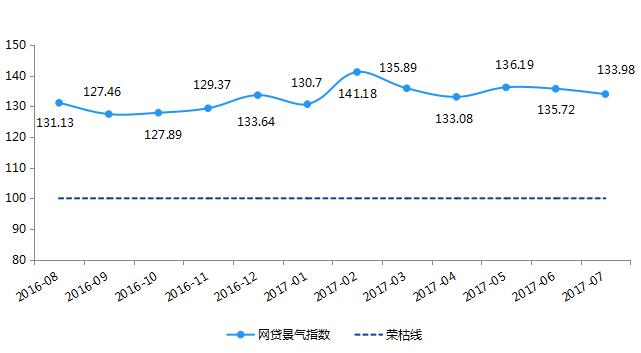 2017 年 7 月中國網貸景氣指數為133.98,同成交量變動趨勢相反,該指數環比出現了小幅度的下降。從景氣指數的 5 個維度指標來看,比擬 6 月,更多的平臺在滿標效率、投資人數指標上同比下降。
