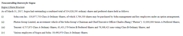 而按照新浪科技查閱 5 月 8 日搜狐向美國SEC提交的10-Q文件顯示,截至 2017 年 3 月 31 日,搜狗共持有 334026595 股普通股和優先股,具體由四方共同持有,別離是: