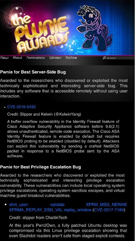 Awards兩個獎項提名。公開資料顯示有白帽黑客奧斯卡之稱的Pwnie