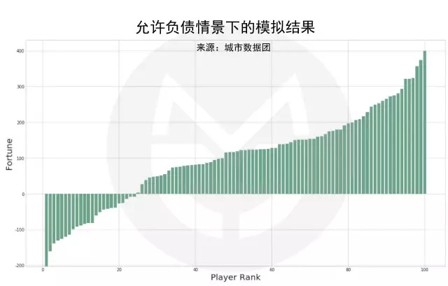 在現實社會中,情境會更復雜一些。好比說,當我們沒錢了,還可以找親友、找銀行、找投資人借債,說不定哪天就東山再起了呢。在允許借債的情況下,游戲結果如下圖所示(排序后結果):