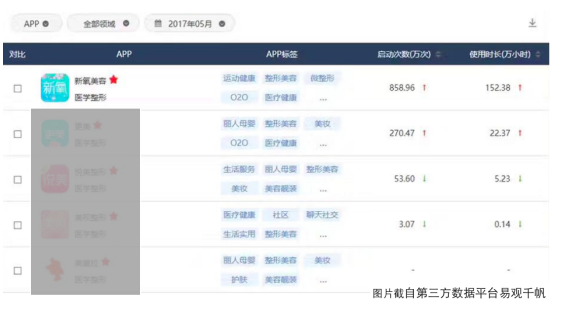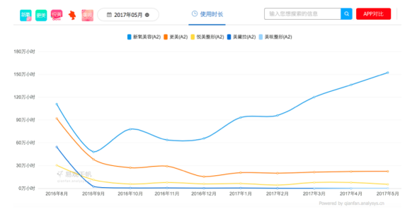 國內知名移動應用數據分析平臺易不雅觀千帆顯示, 2017 年 5 月,新氧APP月度總使用時長超過 152 萬小時,占據醫美APP領域總使用時長84%以上。