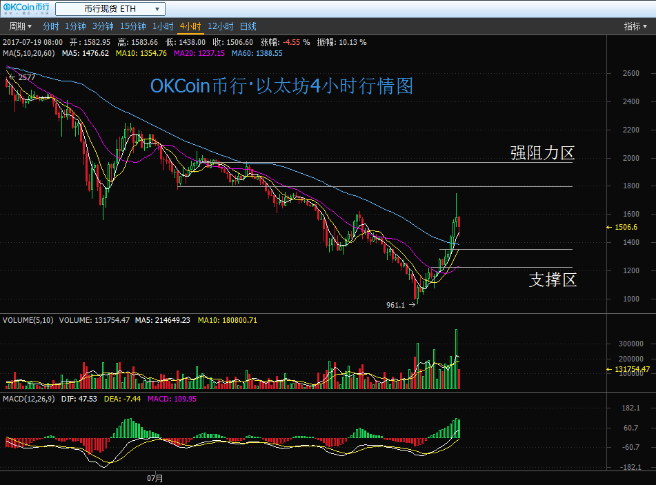 按照國內知名的數字資產交易平臺OKCoin幣行的數據顯示,比特幣昨天(7月18日)價格全天的大部分交易時段都處于向上攀升態勢運行,以小時為節點,幾乎四分之三的時間都是陽線報收,,最高反彈至16150高位,反彈勢頭強勁。截止今日發稿前,價格已經自高位回落,最新交投于15300附近。