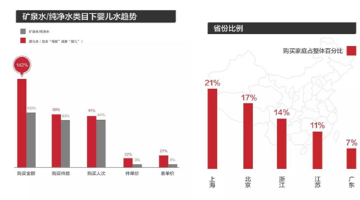 作為高端水的其中之一,天貓大數據顯示,在過去的兩年里,嬰兒水無論在銷量還是購買人數上,增速都超過了包裝水整體的增長,復購率也在持續走強。而且,消費人群集中在“江浙滬”包郵區、“北上廣”一線城市,都是高端消費品的主力客群。