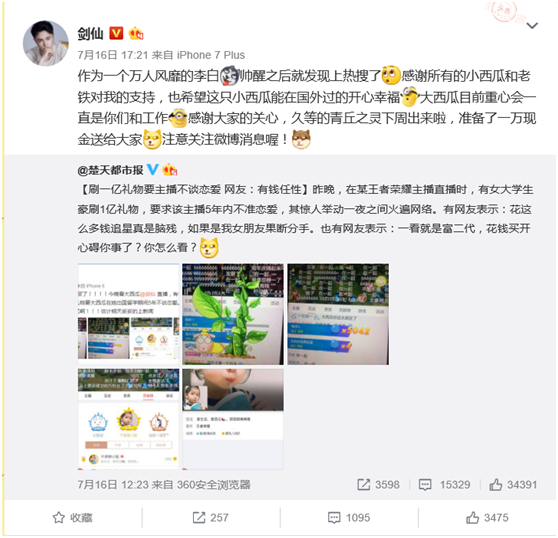 第二天事件迅速火遍網(wǎng)絡(luò),有不少網(wǎng)友體現(xiàn)該女生太瘋狂,甚至留下一系列說是炒作、人傻錢多的惡意評論。不才午的直播結(jié)束后,劍仙不得不在個人微博也給出了回應(yīng):作為一個萬人風(fēng)靡的李白帥醒之后,就發(fā)現(xiàn)上熱搜了。感謝所有的小西瓜和老鐵對我的支持,也希望這只小西瓜能在國外過的開心幸福,大西瓜目前重心會一直是你們和工作,感謝大家的關(guān)心,久等的青丘之靈下周出來啦,準(zhǔn)備了一萬現(xiàn)金送給大家注意關(guān)注微博消息喔!