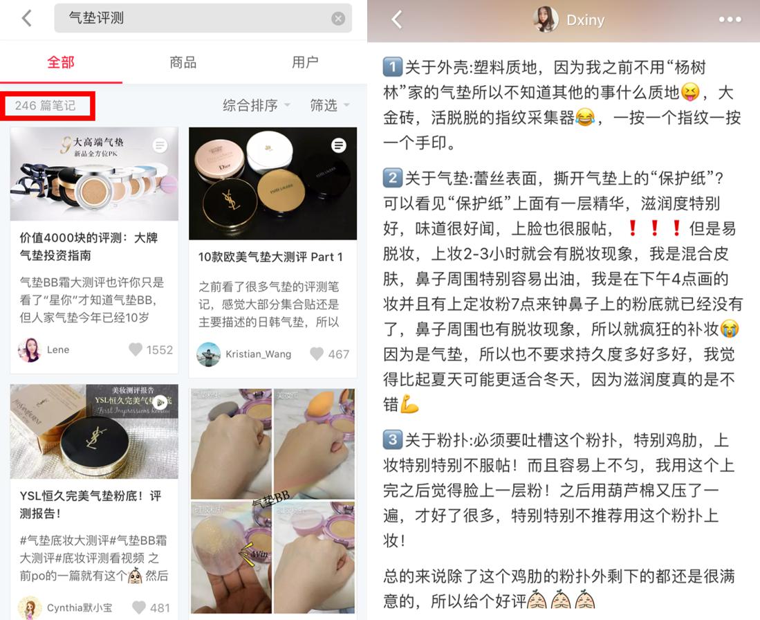 那么作為所謂的競爭對手,在小紅書上搜索“氣墊評測”等關鍵字,相關的內容有 200 多篇,數量如此之多的原因主要是來自于差別用戶的分享。在對其中幾篇閱讀量較高的內容進行抽樣閱讀后發現,小紅書的評測內容基本上為用戶的自身使用結果及心得體會,主不雅觀意見及測試方法單一是其內容的最大特點,較之網易美學評測內容的覆蓋廣泛性及專業性來看,在參考價值層面網易美學的內容顯然更加科學嚴謹。
