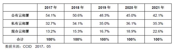 對于中小企業和雙創類企業,仍然更多采用公有云安排模式,預計到 2021 年,公有云模式的占比將連結在40%-45%之間。