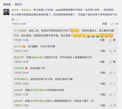 TechWeb查詢了比來幾天易到的官方微博,在留言區,有不少用戶反映,“打不到車”、“退不了錢”。網友@jantion稱,“昨天連續三個時段,yong和舒適型都叫不到車(加價到1.9倍),坐標深圳。估計很多司機提現后都把易到卸載了。我也想把易到卸載了,可是賬戶里還有兩千多塊依然花不出去……”