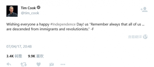 【TechWeb報道】7月5日消息,據國外媒體報道,蘋果CEO蒂姆·庫不日前發Twitter慶祝美國獨立日(每年7月4日)。庫克引用美國第32任總統富蘭克林·羅斯福的一句名言,稱:“請記住,我們大家都是移民和革命者的后代?!?/p>