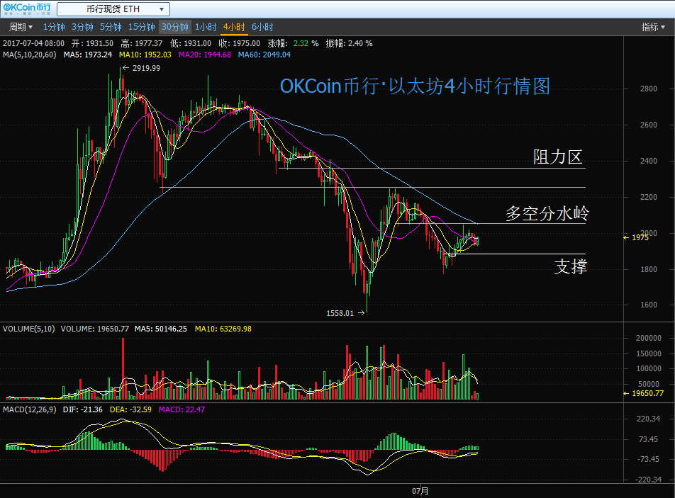 綜上所述,由于 4 小時級別走勢依然維持在較明顯的空頭趨勢傍邊,同時從小周期來看本輪反彈動能比擬其他兩個幣種為最弱一個,,所以操作中要更加謹慎。日內重點關注 2050 一線多空分水嶺,放量上破才可介入看漲,上方關注2250— 2400 阻力區,觸及后出現滯漲即離場不雅觀望;下方支撐1890,放量下破則本輪反彈結束,離場避險。