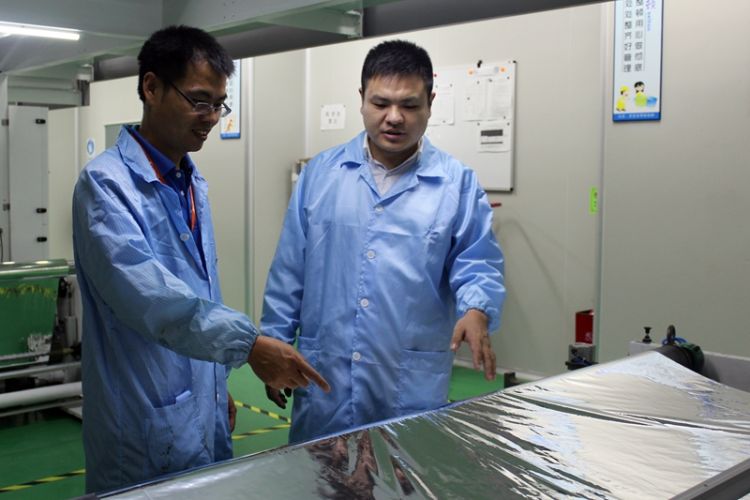 采用柔性生產(chǎn)模式制作的材料經(jīng)過傳送輥,在膠槽涂覆膠黏劑,經(jīng)熱烘道、熱壓復(fù)合后,形成半成品或成品。這些具備超級強(qiáng)度的材料,乍一看與銀色的錫紙無異,“但它卻具有強(qiáng)度高、耐低溫、防腐蝕、防輻射、耐低壓、防紫外線和抗拉伸等功能,你的手指根本不成能戳穿它。”