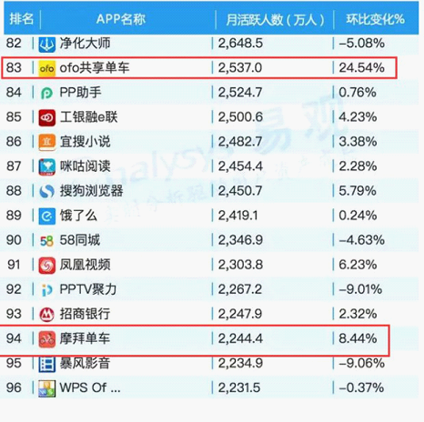 TOP1000 排行榜”顯示,ofo以 2537 萬月活用戶規(guī)模位列排行榜第 83 名,共享單車行業(yè)排名第一,摩拜月度活躍用戶位2244. 4 萬,排名第 94 位,落后于ofo11 個(gè)位次。ofo活躍用戶數(shù)比摩拜單車多292. 6 萬。在環(huán)比增速方面,ofo的 5 月環(huán)比增長24.54%,而摩拜環(huán)比增長僅為8.44%,ofo環(huán)比增速是摩拜的近 3 倍,成為共享單車行業(yè)活躍用戶規(guī)模和用戶增速的第一平臺。