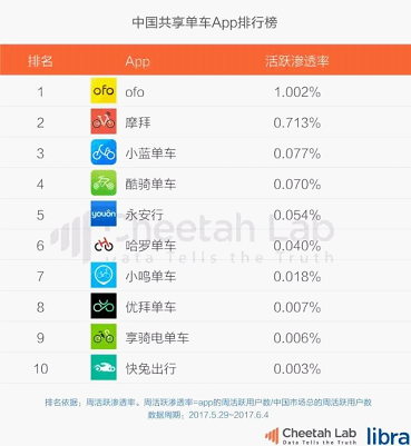 Lab(獵豹全球智庫)發(fā)布了“中國共享單車App排行榜”,在這份排行榜中,ofo活躍滲透率為1.002%,居共享單車行業(yè)榜首,摩拜單車活躍滲透率為0.713%,排名第二。ofo活躍滲透率占優(yōu),是摩拜的1. 4 倍還多。