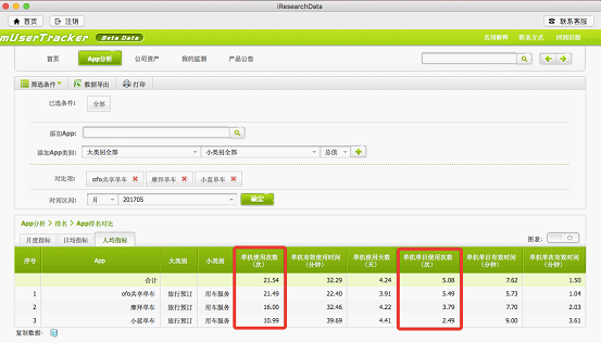 艾瑞 5 月份數(shù)據(jù)顯示,ofo活躍用戶 5 月的月度總使用次數(shù)為134760. 19 萬次,摩拜用戶月度總使用次數(shù)為93399. 39 萬次。ofo用戶月總使用次數(shù)領(lǐng)先摩拜超 4 億次、約是摩拜的1. 4 倍。艾瑞數(shù)據(jù)還顯示,ofo單個(gè)用戶日均使用次數(shù)為5. 49 次,摩拜為3. 79 次,,小藍(lán)單車為2. 49 次。ofo在單個(gè)用戶日均使用頻次方面是摩拜的近1. 5 倍,成共享單車行業(yè)用戶最高頻、粘性最強(qiáng)的平臺。