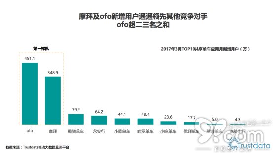 TOP1000 排行榜”,其中,ofo以 2537 萬的活躍用戶數排名總榜單的第 83 位,摩拜單車以2244. 4 萬的活躍用戶排名總榜單的第 94 位。差距的不停拉大,似乎也預示著兩者在共享單車市場中第一和第二地位安靖。