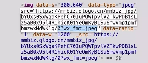 以JPEG圖片為例,在圖片位置打開審查元素,會發現圖片地址src字段結尾有個 “0?wx_fmt=jpeg ”。
